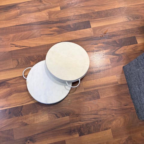 Bambus regnstaver med håndmalt dekorativt mønster i flere farger. Egner seg som enkle rytmeinstrumenter i musikkundervisning, barnehage, skole eller hjemmebruk. Kan også brukes som dekorative elementer i interiør. Laget av naturfarget bambus med malt felt midt på hver pinne.