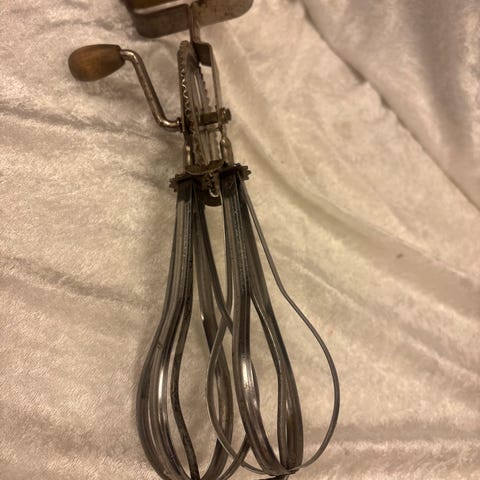 Sjarmerende, gammeldags håndvisp med glassbeholder/målebeger. Mekanisk sveiv med metallgir og håndtak. Måleangivelser i glasset (cups). Fin både til bruk og som dekor på kjøkkenet.