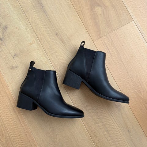 Bianco støvler i størrelse 36. Ankelhøye svarte støvler med spiss tå og blokkhæl. Elastiske paneler i siden for enklere av- og påtaking. Overdel i glatt materiale med enkel, klassisk utforming. Passer til hverdagsbruk og enklere penere anledninger.