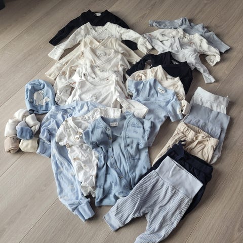 3 langermet bodyer, 5 singlet bodyer, ett vaffel sett, 2 gensere fra HM. 1 body fra lil atelier. Pluss en ull bukse fra marmar i størrelse 74 og en cardigan fra lil atelier i størrelse 74.
