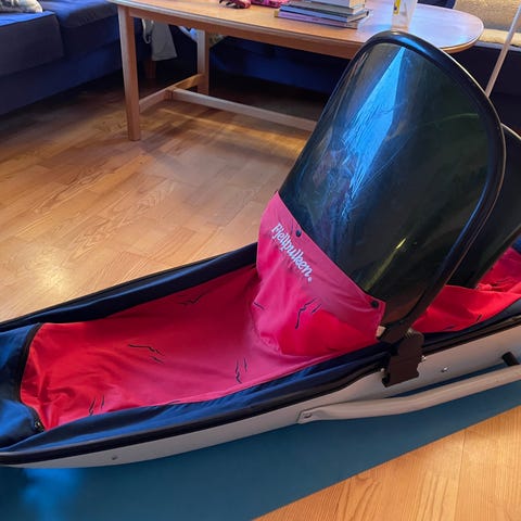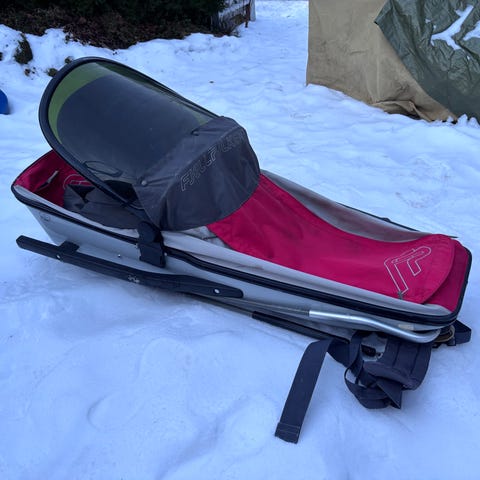 Pulk med hardt skrog og vindskjerm foran. Rødt overtrekk med stramming rundt åpningen. Leveres med drag og hoftebelte for trekking. I tillegg følger det med poser/innlegg som kan brukes som ekstra isolasjon eller beskyttelse i pulken.