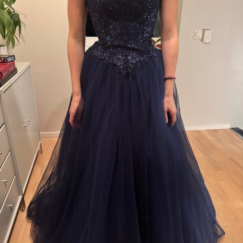 Nydelig Alexandra Ritzi ballkjole med dekorative detaljer. Skulderstropper kan enten sitte ytterst på skulder slik som på bildet eller tas opp over skulder. Kjolen er tilpasset i lengde til en som er 167 cm høy. Snøring i ryggen gir mulighet for justering av passformen.