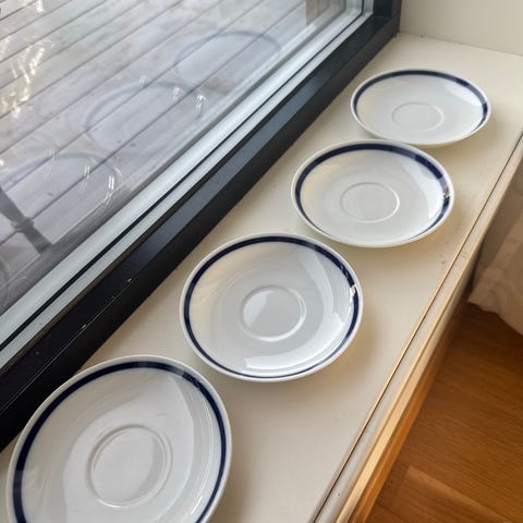 Pent sett med 6 små asjetter i hvitt porselen med gjennombrutt kant og blomsterdekor i midten. Klassisk og dekorativ stil – fine til kake, dessert eller som pynt.
