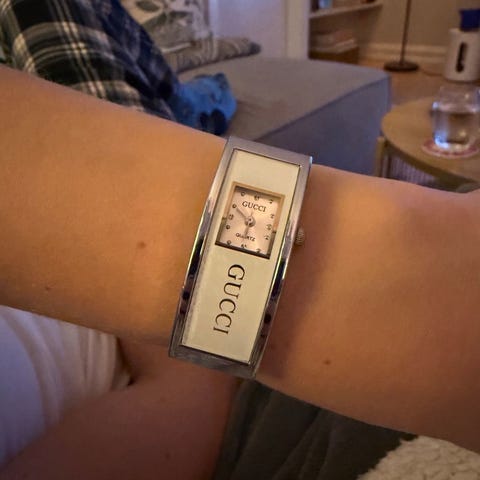 DKNY dameklokke i sølvfarget metall. Klokken har bred lenke/bøyle med integrert kasse og tydelig D&G-logo på forsiden. Lite, rektangulært analogt ur med lys skive og to visere. Metalllenke med foldespenne på baksiden. Passer som armbåndsur til hverdags- og penbruk.