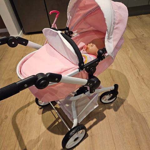En eldre simo dukkevogn fra 90-tallet selges. Den har en skade nede ved Venstre fremhjul der stålet har løsnet fra understellet. Vi har brukt litt strikk til å reparere den slik at den kjører rett, men mulig det går an å få en sveiser til å reparere den ordentlig!