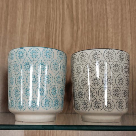 2 små Bloomingville krus uten hank i keramikk med mønstret dekor. Settet består av to krus i lyse toner med geometrisk mønster, ett med blått mønster og rød kant, og ett med grønt mønster og gul kant. Krusene passer til kaffe, te eller andre varme og kalde drikker, og kan også brukes som små penneholdere eller til oppbevaring på kjøkkenet. Designet er typisk for Bloomingville med enkle former og grafisk dekor.