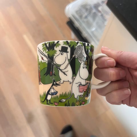Arabia Mummi krus med motiv fra 2019. Kruset er laget i keramikk og har et fargerikt Mummi-motiv rundt hele koppen. Passer til varm og kald drikke i hverdagsbruk eller som samleobjekt for Mummi-serien fra Arabia.