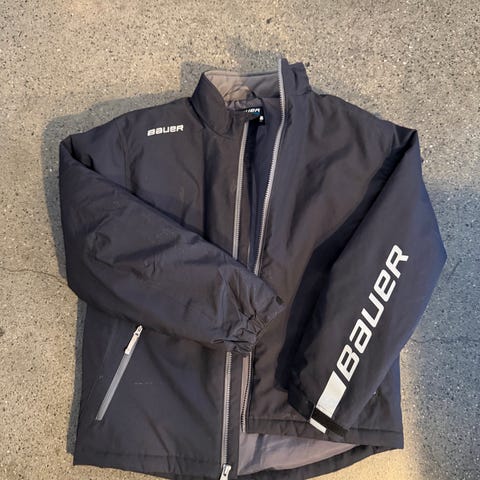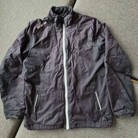CCM hockeyjakke for ishockey, juniorstørrelse 140 (M Youth). Jakken er svart med hvit glidelås i front og glidelåslommer i siden. Lett ytterjakke som passer til bruk til og fra ishall og trening, eller som hverdagsjakke for barn/ungdom som driver med ishockey.