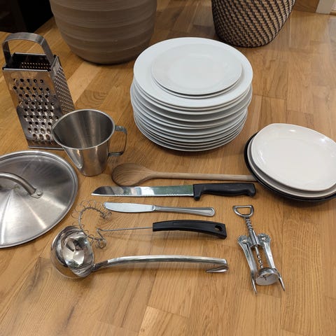 Boller, kniver, noe bestikk, litermål, redskaper - noe veldig godt brukt noe godt brukt og noe lite brukt