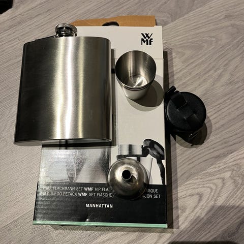 Schou Hip Flask Set lommelerkesett i rustfritt stål 18/8 med kapasitet på 210 ml. Settet inneholder lommelerke, trakt og fire kopper, levert med etui i skinn. Egnet for oppbevaring og servering av drikke på tur og andre utendørsaktiviteter.