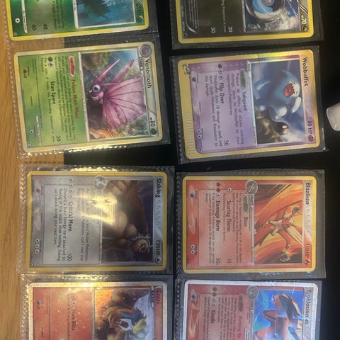 Samlingen på bildene består av ulike Pokémon-kort med både vanlige og holo/reverse holo-kort. Kortene viser flere forskjellige Pokémon-figurer, trenere og energikort fra ulike serier og typer (blant annet vann-, gress-, psykisk- og fargeenergikort).