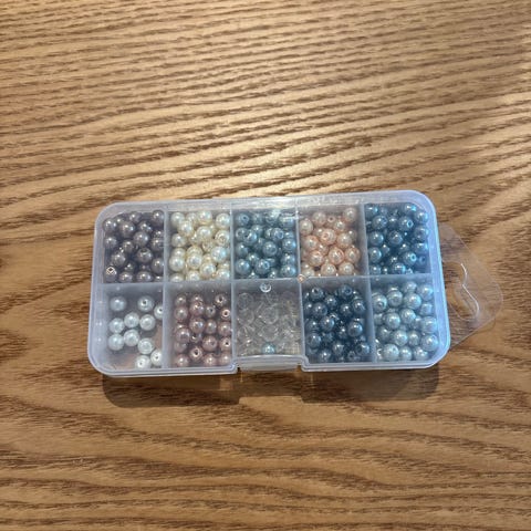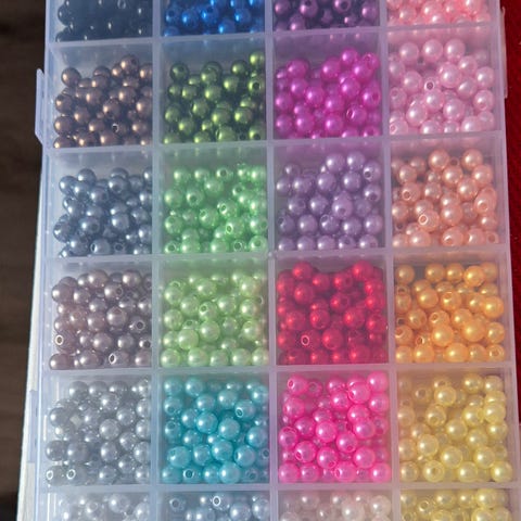 Perler i oppbevaringsboks med flere små rom. Inneholder små perler i ulike farger, egnet til hobbyprosjekter som smykker, dekorasjon eller annet håndarbeid. Gjennomsiktig plastboks gjør det enkelt å se og sortere fargene.