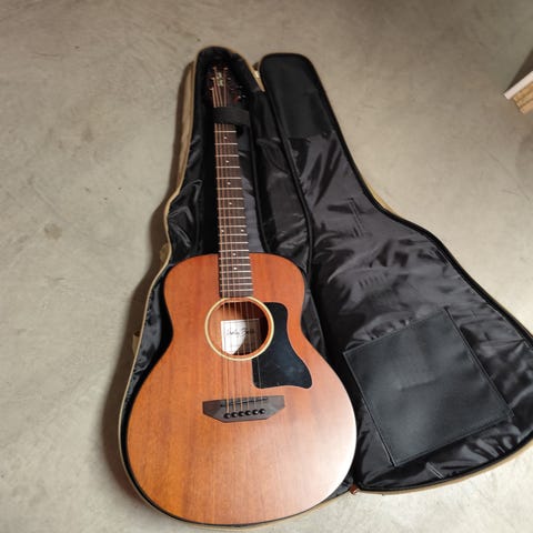 «Maestro by Gibson 30" mini akustisk gitar er en versjon av Gibsons gitar med runde skuldre i 3/4s versjon, som passer perfekt for barn og for deg med små hender. Halsen har gripebrett med 19 bånd, og er enkel og behagelig å spille på. De krombelagte stemmeskruene er formstøpt for ekstra stabilitet når du stemmer.»