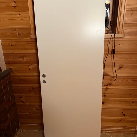 Innerdør i tre med enkel overflate og håndtak. Egner seg som innvendig dør i bolig, bod eller lignende rom. Døren fremstår som ubehandlet eller enkelt behandlet, og kan males eller tilpasses etter behov. Passer for montering i eksisterende karm med tilsvarende mål som døren.