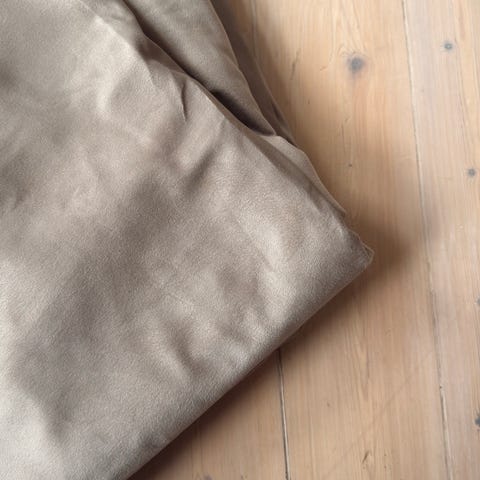 Kid gardiner i beige farge. Gardinene har påsydd rynkebånd øverst for oppheng på skinne eller med kroker. Tekstilen fremstår som en myk, ensfarget metervare som skjermer for innsyn og demper lys. Passer til stue, soverom eller andre rom der det er behov for enkle, nøytrale gardiner.