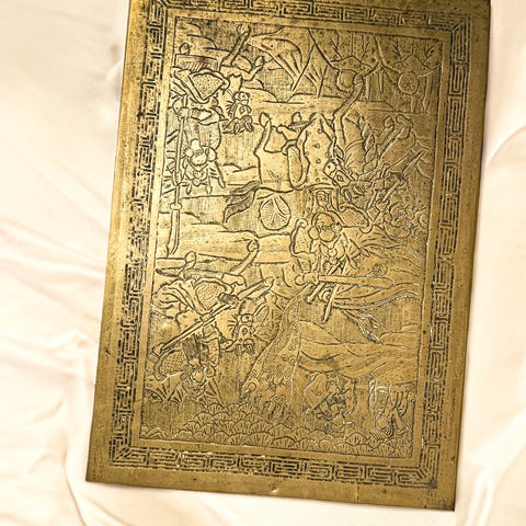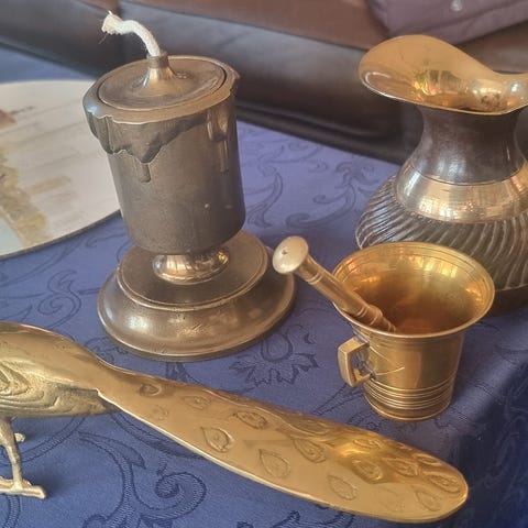 3 flotte messing objekter..morter..cowboy boots.vase+ pUZZLE spill