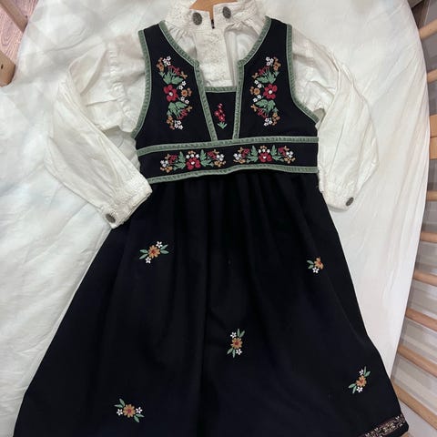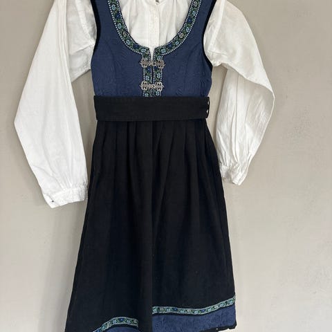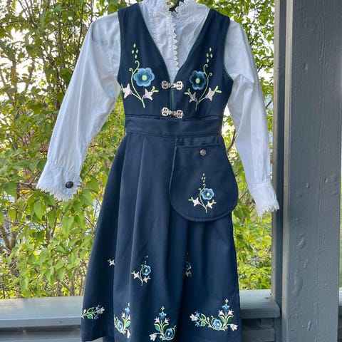 Størrelse 8-10 år. Måler 101 cm fra øverst på skulder og ned til nedre del av skjørtet.