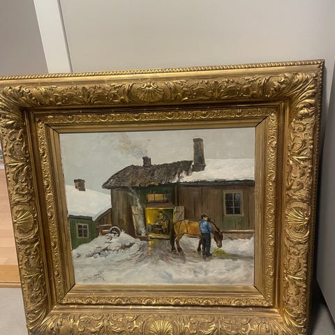 Signert Ivar Falch nede i høyre hjørne. Baksiden viser lerret spent opp på blindramme, med opphengssnor og etikett fra Blomqvist.