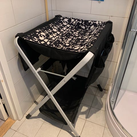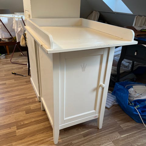 IKEA stellebord i tre med hvite flater. Bordet har en stelleflate øverst med kant rundt, og en praktisk hylle under for oppbevaring av bleier, klær eller annet utstyr. Egnet til bruk på barnerom eller bad der det er behov for en fast stelleplass. Materiale hovedsakelig treverk med malte/laminerte flater i hvitt.
