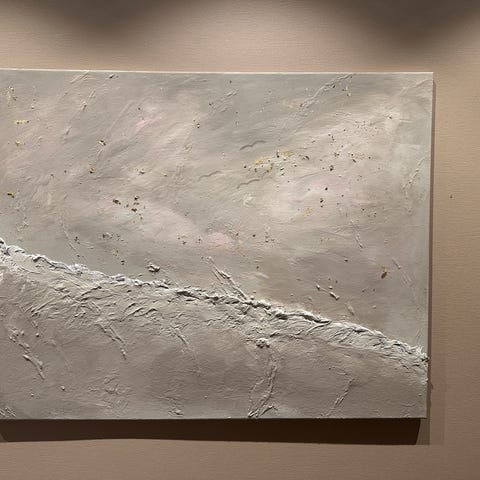 Stort bilde i moderne stil kjøpt på kremmerhuset. Håndlaget struktur i hvitt. Bilde er kjøpt i forbindelse med visning og fremstår som nytt.
