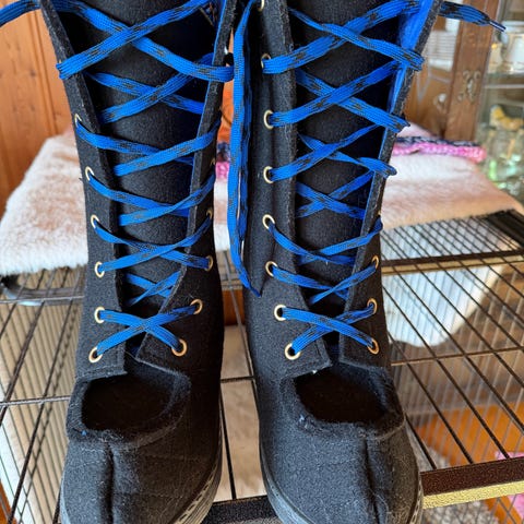 Modellen er håndlaget i Norge, med rød ullfilt i overdelen og kraftig, mønstret yttersåle. Egnet som varme innesko eller lett fottøy utendørs i tørt vær.