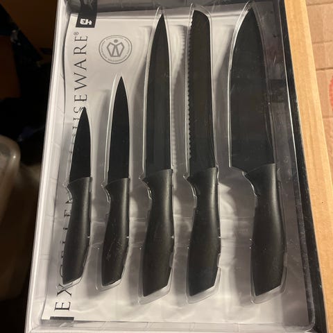 Uåpnet Hasaki knivsett. 1 st kokkekniv og 4 stk biffkniver.