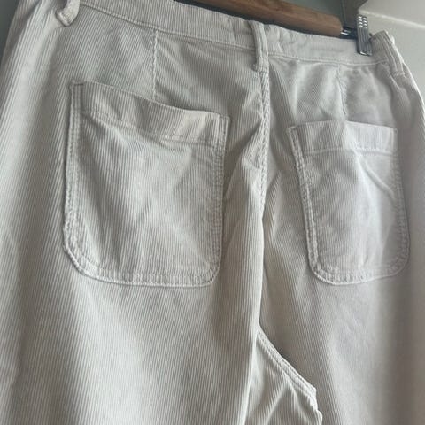 Beige cordfløyelsbukse for dame i størrelse 44. Buksen har klassisk passform med skrålommer foran og lommer bak, hvorav begge med knapp. Materialet er cordfløyel som gir en myk og strukturert overflate. Passer til hverdagsbruk og kan kombineres med ulike overdeler for et avslappet uttrykk.