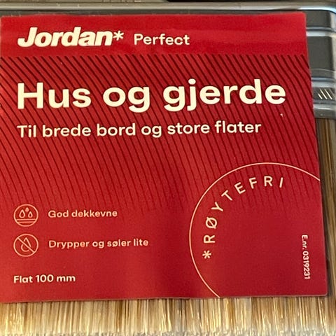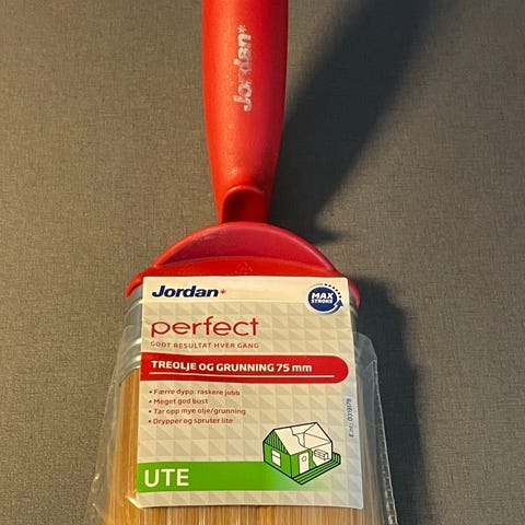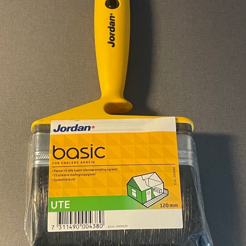 Jordan Perfect hus og gjerde flat pensel 120 mm. Penselen er beregnet for brede bord og store flater. Busten er røytefri og utformet for jevn dekkevne. Skaftet har ergonomisk grep i plast/gummi og opphengskrok. Egner seg til maling av hus, gjerder og andre større utendørs flater.