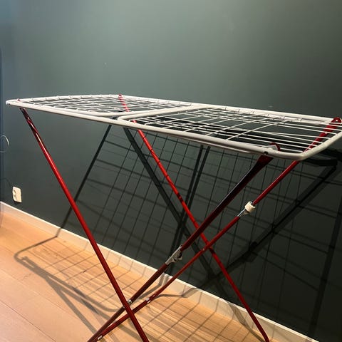 Sammenleggbart tørkestativ i svart metall. Stativet har flere tørketråder og vinger som kan felles ut for ekstra tørkeplass. Egnet for innendørs bruk til tørking av klær, håndklær og annet tøy. Kan enkelt slås sammen for plassbesparende oppbevaring når det ikke er i bruk.