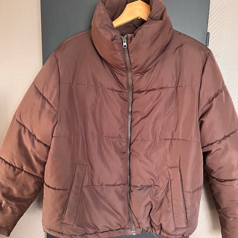 Bik Bok ytterjakke for dame i brun farge, størrelse M. Den har glidelås og knappelukking foran, samt lommer i front og på ermet. Midjen har snøring for justering av passform. Fôret innside gir ekstra varme, egnet som yttertøy i kjøligere vær.