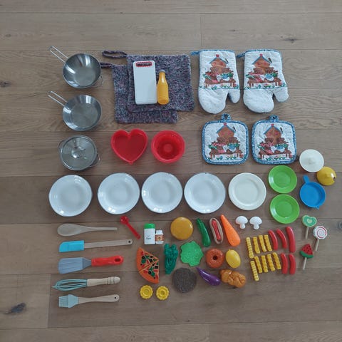 Pakke med lekemat i tre (appelsin og eple i stoff) og diverse kjøkkenutstyr som kasserolle, stekepanne, skåler, skjærebrett, kjøkkenvekt, skjærebrett, visp, skjeer, kniv, kjevle, stekespader osv.