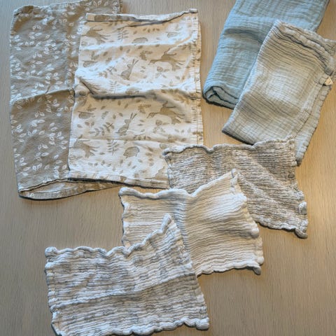 Fine hjemmesydde gulpekluter til å legge over skulderen. Fra røyk- og dyrefritt hjem.
