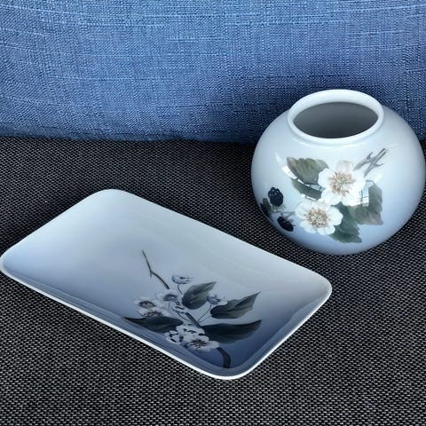 Elegant porselensvase fra Royal Copenhagen, produsert i Danmark. Dekorert med blomster- og bærmotiv i myke blå og naturtoner. Klassisk og tidløs form som passer både alene og med blomster.