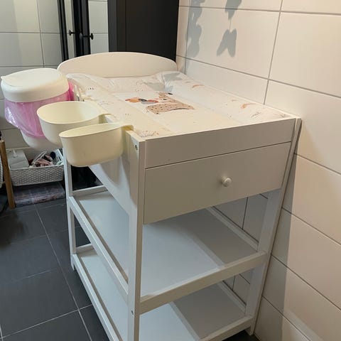 Lite/ingenting brukt. Baby har kun brukt den litt på dagtid de tre første ukene (sov da med babynest oppi). Sengen har åpne sprosser på sidene og står på hjul for enkel flytting.