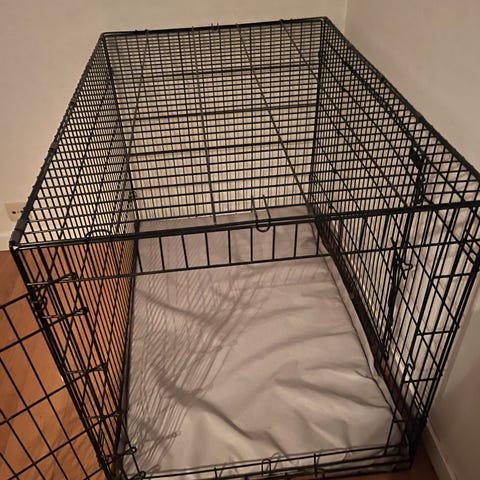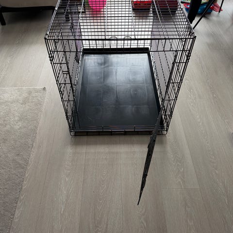 Selger et stort sammenleggbar hundebur i metall fra dogman og friends. Buret har gitterkonstruksjon med uttakbar bunnplate i plast for enkel rengjøring. Det har dører med låsemekanisme i front og på siden, som gir fleksibel plassering.