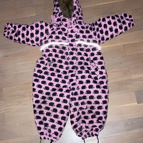 Lindex vinterdress i størrelse 80. Kjempesøt mønster og holder de små tørre og varme. Strikker u der føttene og hette med fuskepelskant.