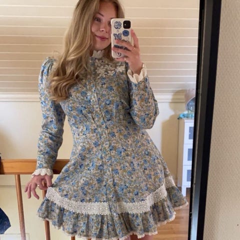 Kjolen er i str M. Den har et flatterende snitt med markert liv og vide puffermer (sommerfugl-ermer) som gir et elegant og lett uttrykk. Trukne knapper fra halsen og helt ned gir et eksklusivt og gjennomført preg.