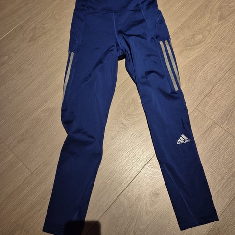 Adidas løpetights for dame i størrelse S. Tightsene er svarte med karakteristiske Adidas-striper langs sidene. Elastisk linning med innvendig snøring for justerbar passform. Egnet til løping og annen trening. Materialet er lett og pustende syntetisk stoff som tørker raskt og gir god bevegelighet under aktivitet.