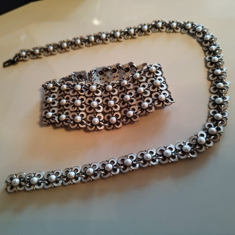 Selger et vakkert arvet smykkesett for min søster, laget av Willy Winnæs.- For David-Andersen. Tungt og fint. Små brikker som er festet sammen. Ligger fint mot kroppen. Smykkene er 925 sterling sølv med hvit emalje. Settet består av armbånd og halskjede. Selges samlet.