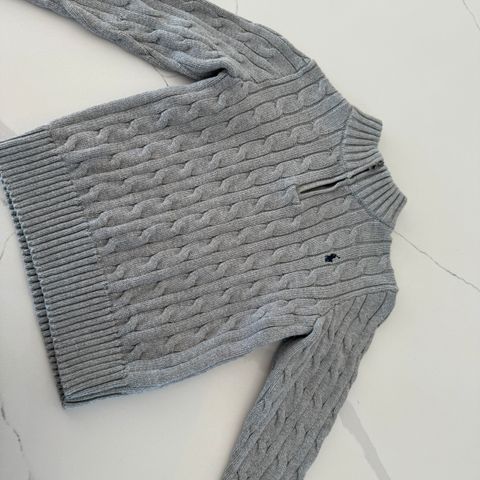 Polo Ralph Lauren genser for barn i størrelse 3-4 år. Unisex-modell i grå bomull med rund hals. Strukturstrikket mønster og ribbekanter på hals, ermer og nederkant. Brodert logo på brystet. Egnet til hverdagsbruk og som et ekstra lag på kjølige dager.