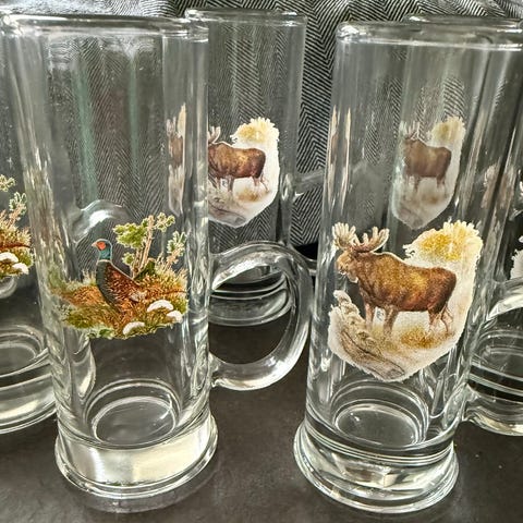 To glass med fuglemotiv fra villmarks serien. Glassene er dekorert med fargerike natur- og fuglemotiver på utsiden. 17cm høyde.
