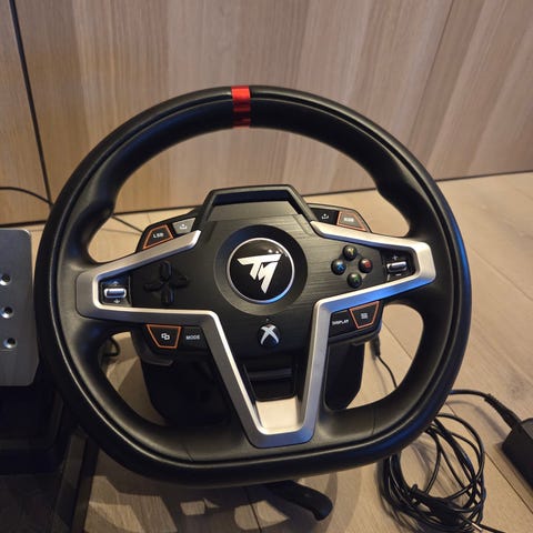 Rattet har skinntrukket felg med innebygde knapper og styrekors tilpasset ulike kontrolleroppsett. Enheten har festeordning for montering på bord eller stativ.