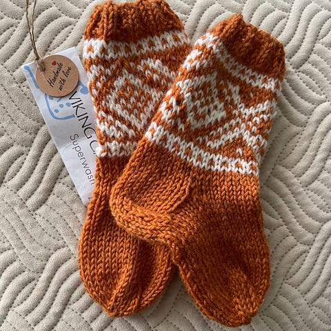 Sokker i str. 25-27 som passer for barn i 3-4 år, strikket i Mariusmønster i 100% superwash ull.