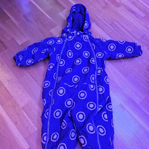 Fin å hel vinterdress med 2 glidelåser, hetten, fleece på innsiden å i hetten, nye gummistrikk til å ha under foten... dressen er god å varm på kalde vinter dager... liten lomme på forsiden av dressen.