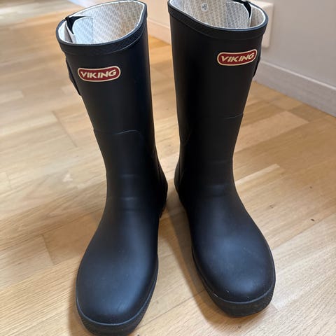 Viking regnstøvler i størrelse 38. Høye støvler i svart gummimateriale med grov såle for godt grep. Klassisk modell med Viking-logo på skaftet. Egnet til bruk i regnvær, på tur og i vått terreng.