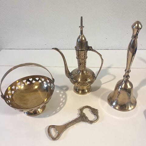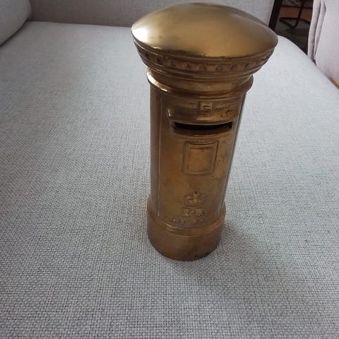Oval vintage boks i metall med lokk. Boksen er gullfarget og har et opphøyd englemotiv på lokket. Egner seg til oppbevaring av småting som smykker, nøkler eller andre små gjenstander. Kan brukes som dekorativ gjenstand på bord, hylle eller kommode.