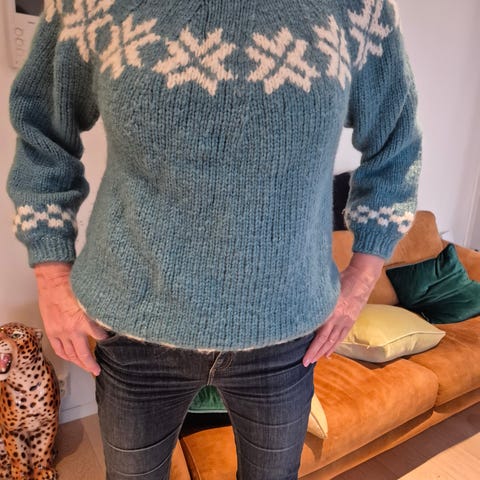 Ullgenser i størrelse L selges. Veldig fin grønnfarge. Strikket i dobbelt tråd Kidsilk Erle fra Dale garn.