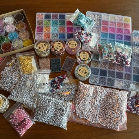 Perlesett i plastboks med flere rom. Inneholder små perler i ulike blå og turkise nyanser, samt noen metallfargede deler som kan brukes til smykke- eller hobbyprosjekter. Boksen har lokk og inndelte rom som gjør det enkelt å holde orden på de forskjellige typene perler og deler. Egnet til hobbybruk som armbånd, halskjeder og andre perleprosjekter.