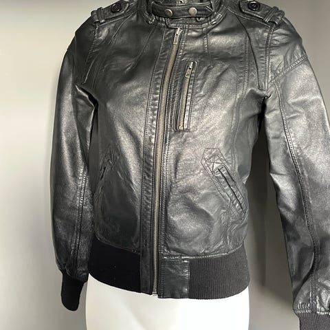 ONLY skinnjakke for dame i størrelse S. Jakken er svart og laget i skinnmateriale med ribbestrikkede mansjetter og linning. Den har høy krage og glidelåslukking foran. Passer som ytterjakke i overgangssesonger og til hverdagsbruk.