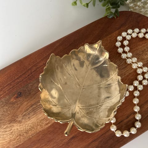 Vintage bladformet skål i sølvplett . Skålen har form som et blad med stilk og tydelige årer i overflaten. Undersiden har små kuler som føtter som løfter skålen litt opp fra underlaget. Egner seg til oppbevaring av småting som smykker, nøkler eller andre dekorative gjenstander, eller som ren pyntegjenstand på bord eller hylle. L:18,5 B:13 cm. Søkeord: skål, fat, smykker,smykkeskål,smykkeskrin,kuleben,interiør,dekor,dekorasjon,stue,soverom,bad